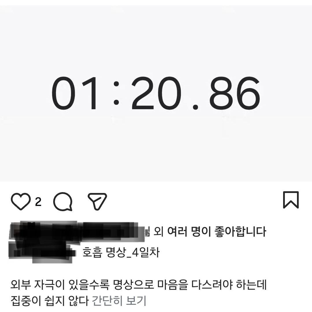 호흡 명상은 처음 접하는 사람에게 다소 추상적으로 느껴질 수 있어서, 처음부터 잘하려고 하면 쉽게 포기하게 되기도 합니다. 일반적으로 호흡 명상이 가장 순수한 형태라고 알려져 있지만, 제 경험상 처음 시작한다면 이전 글에서 설명했던 숫자를 세는 수식관 명상처럼 좀 더 구체적인 방법부터 접근하는 것도 좋은 방법입니다. 이런 과정을 거쳐 점차 순수한 호흡 명상으로 확장해가면 부담 없이 명상을 익힐 수 있습니다.