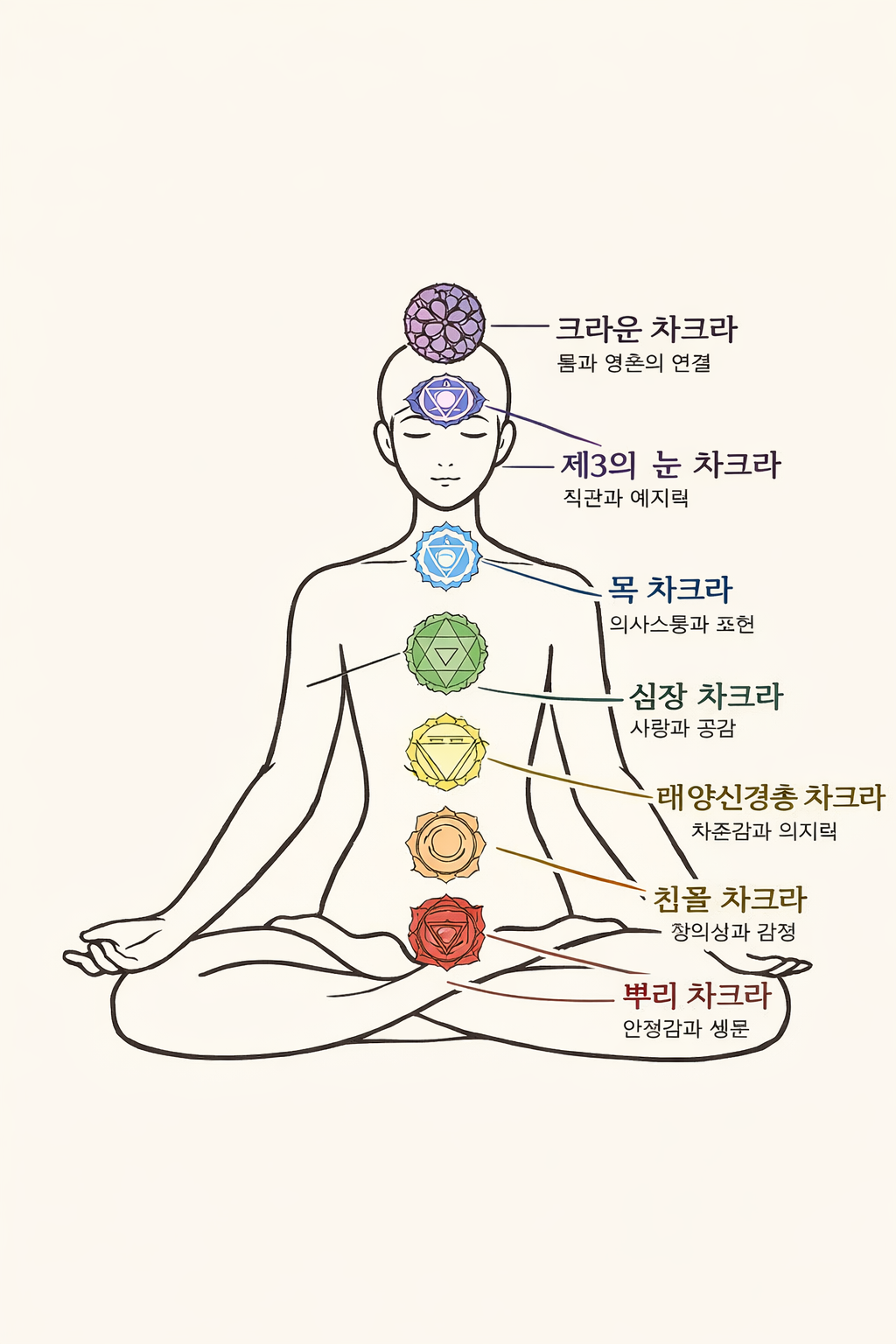 뿌리 차크라(Muladhara): 척추 기저부, 꼬리뼈 부근에 위치하며 안정과 생존 본능을 관장합니다